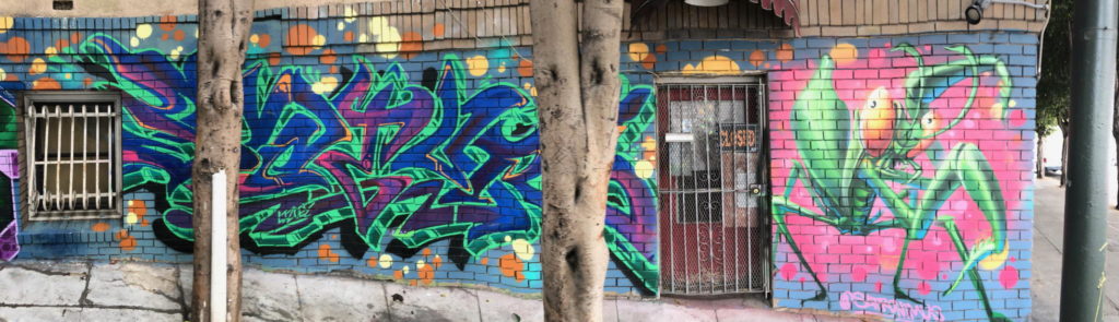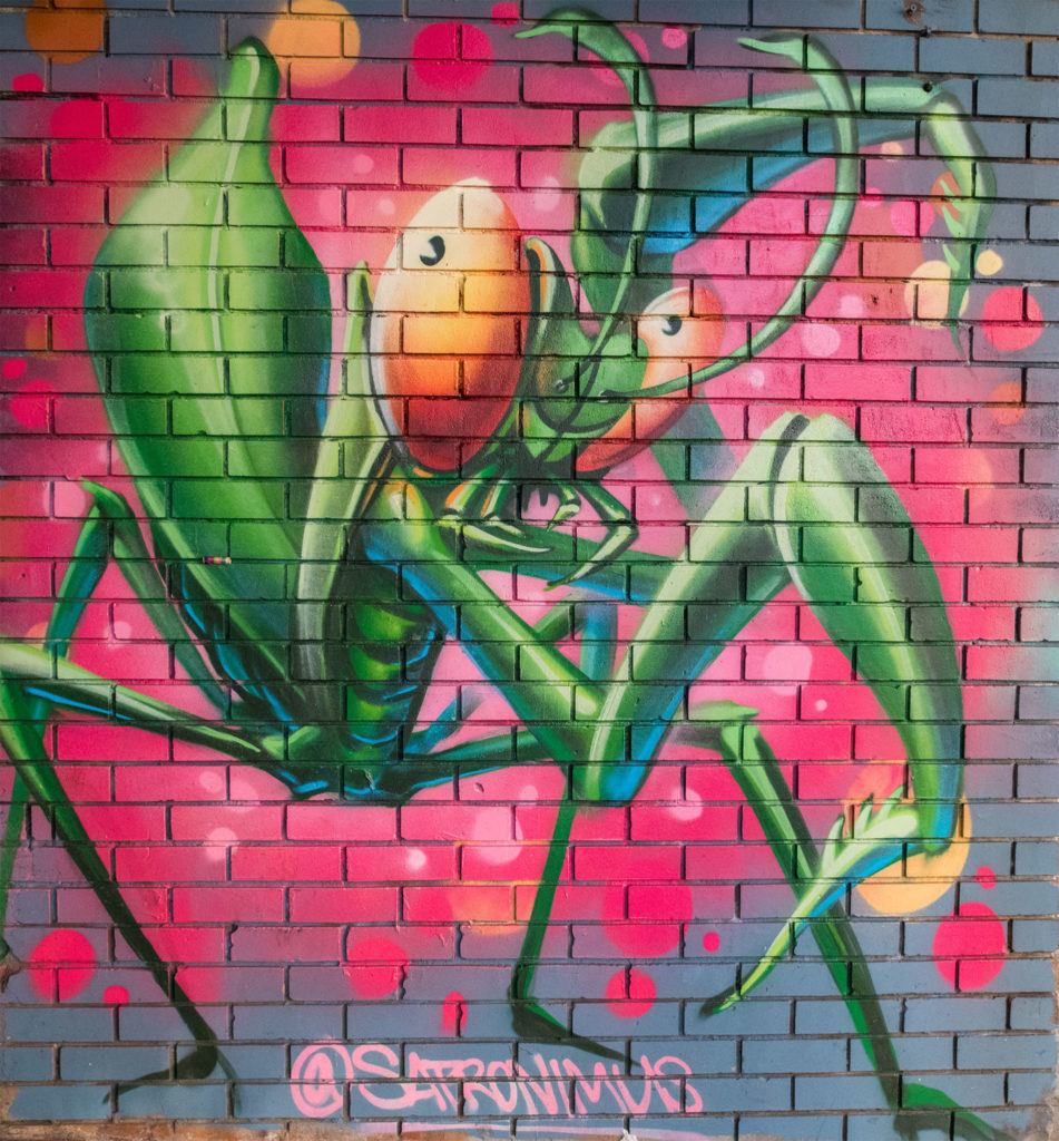 Both painted at Ada Alley, the painting to the left focuses more heavily on the flow of the letters instead of a specific meaning. The praying mantis to the right acts as a protector of the neighborhood.