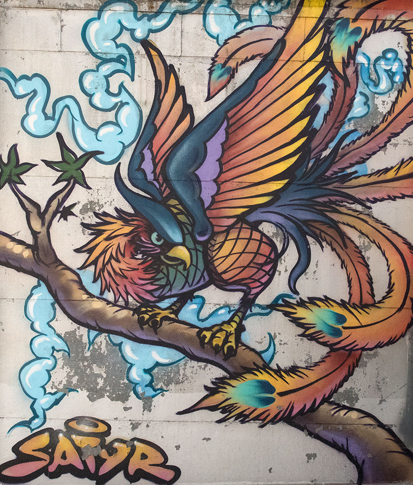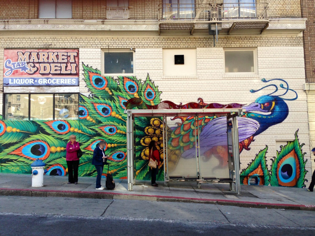 Located in the Tenderloin, the peacock stands as a protector, watching out for the people of the neighborhood. Satyr was inspired to create this piece because peacocks do not let snakes live within their territory, killing them if they come close to them.