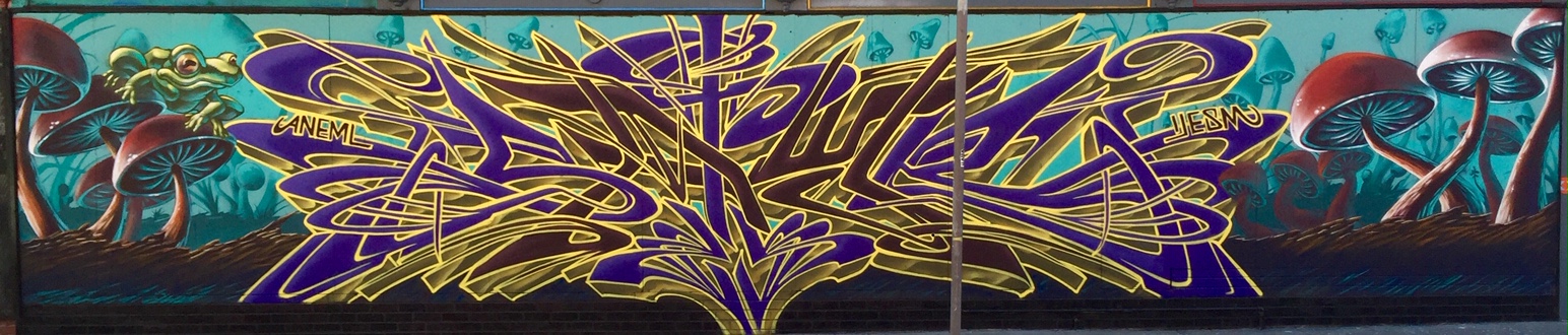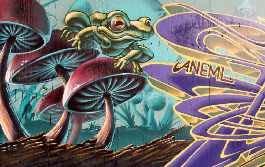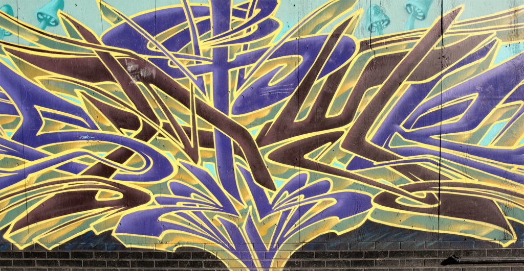 Although you may not be able to tell at first glance, this mural has a subtle drug reference located within its vibrant design. This painting mixes his straight-line graffiti with his more organic nature composed art. All of Satyr’s pieces are painted with spray-paint.