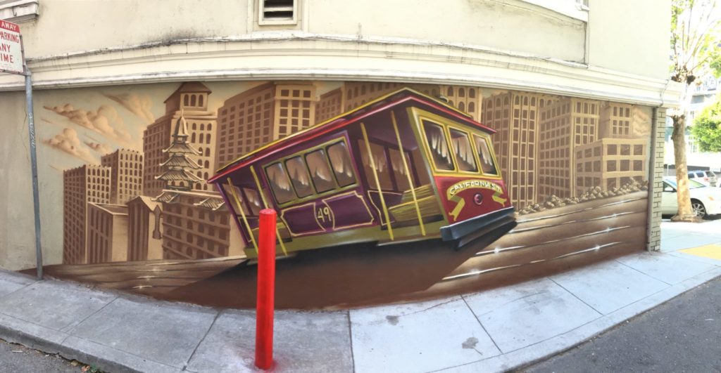 This realistic mural is a spin on Satyr’s extravagant and ‘trippy’ designs. San Francisco is one of the few places in the world where people can ride on a national historic landmark. The historic cable car is considered an icon of San Francisco, carrying millions of tourists from all over the world every year.